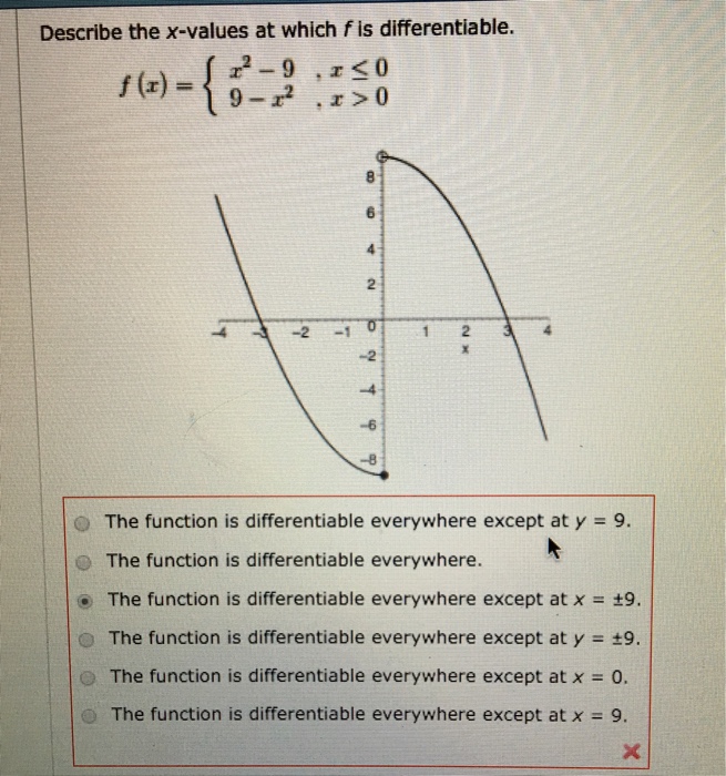 Since x2 9 is a polynom it is differentiable everywhere. Describe the x-values at which f is differentiable.